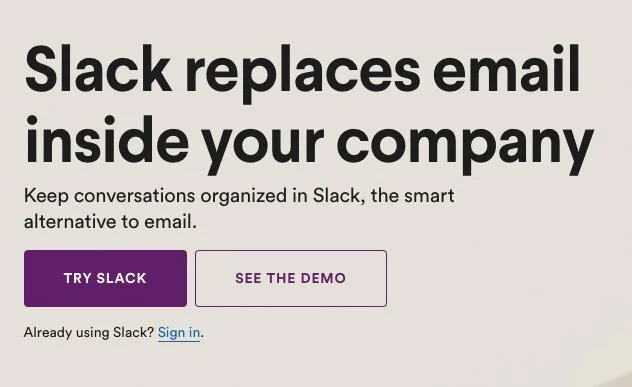 If you’re not familiar with Slack, it’s a well-designed messaging app for organizations - infinitely customizable, but still extremely simple to use. At the beginning of the year, here’s their above-the-fold website headline: